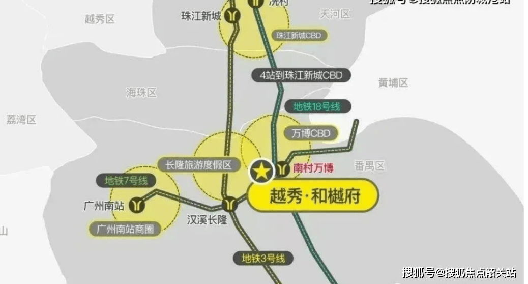 9. 万博和樾府虽非明确的“区府+TOD”双核心联动发展项目,但地处万博CBD核心,紧邻区域交通枢纽,具备类似的发展优势。万博作为番禺的重要商务区,承担着区域经济发展的核心功能,类似于“区府”的经济带动作用,聚集了大量企业和资源。项目周边地铁线路密集,南村万博站作为7号线号线的换乘站,是重要的TOD节点,带动了周边商业、居住等功能的融合发展。和樾府依托万博CBD的产业和商业资源,以及地铁TOD的交通优势,实现了居住、工作、交通的高效联动,居民既能在CBD内便捷工作,又能通过地铁快速出行,享受了类似“区府+TOD”双核心联动带来的优质生活。